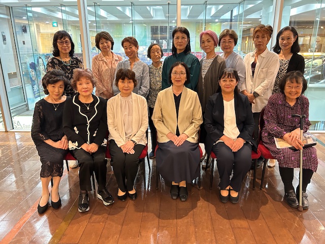 一年ぶりでお会いする方、会場に近いので、初めて参加された方など14名が参加、本部から平山会長、大野副会長にお越しいただき、大学の様子や築地本願寺の境内内に創立百周年を記念して武蔵野女子学院発祥の地の記念碑を設置されているお話を伺いました。